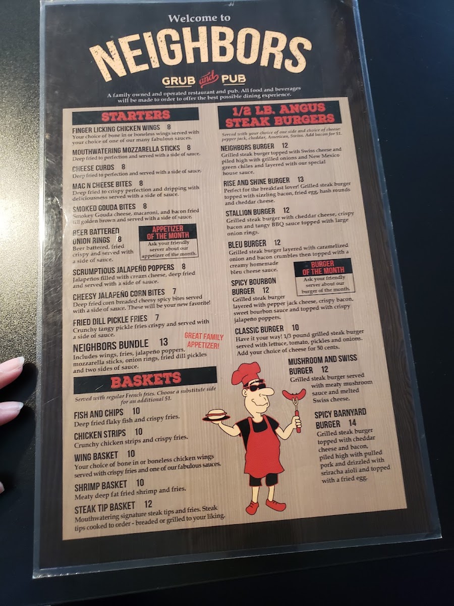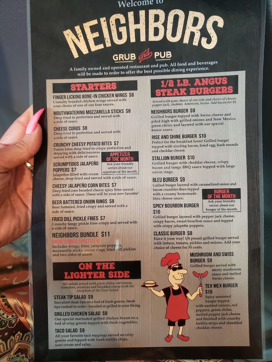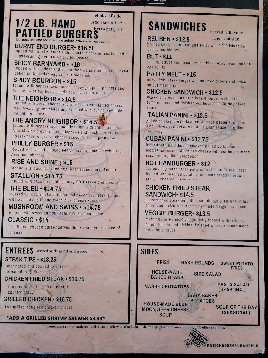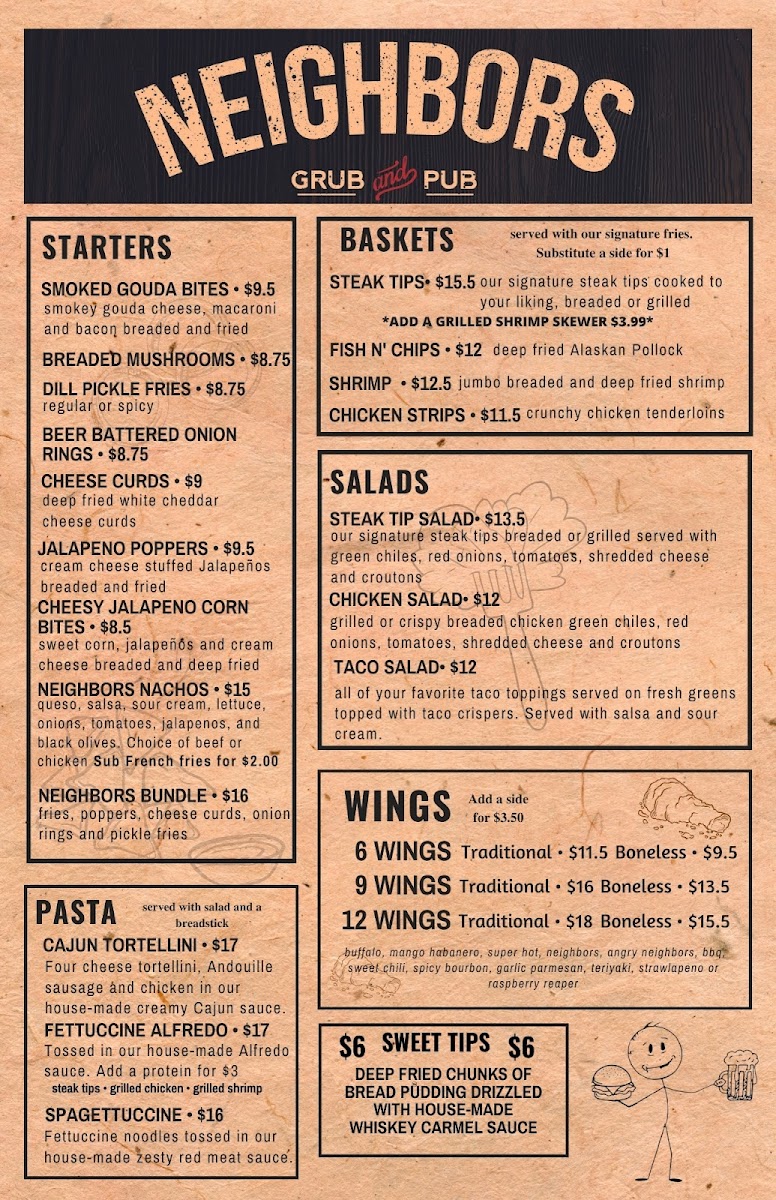 Whether you’re stopping by for lunch or a casual dinner, Neighbors Grub and Pub is a perfect spot to enjoy great food and a lively ambiance.
